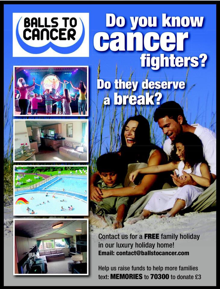 We are Balls to Cancer- a registered charity, and it is our aim to fight cancer with fun! We are raising funds for male cancer awareness and education. We occasionally donate a proportion to other associated causes and research. 100% of funds raised or donated goes into this charity for our aims below….. We are spending time and money on a nationwide (and in some cases worldwide) awareness campaign through the media, social networks, leaflets and posters, to try to make both men and women more aware of the dangers of cancer and to help men help themselves. We believe that prevention is the key to beating cancer. We want to open a male only contact point for men/boys who have been diagnosed with cancer or are worried about cancer and their families. So if you know anyone who needs our help or if you need our help yourselves, please contact us today. We are here to help you so get in touch. We are funding an education programme for teenagers to help them understand and take away the taboo of talking about testicular cancer and asking for help. We are currently setting this up with our own local authority with the hope of going nationwide next year. We are also putting aside a small amount of funds for research projects we feel are making headway in their particular field. This funding will also be there to help individuals who need specialist treatment, or support for families affected financially due to treatment. We have already given money to many research projects and hospitals such as Birmingham, Wolverhampton & Brunel Universities as well as funding special sensory equipment of The Birmingham Children’s Hospital. We are working on funding our #SuperHeroChemo Boxes for children fighting cancer with chemotherapy. These boxes encase the very visible Intravenous bag and help the children cope with the stress of chemotherapy by giving it to them as Superhero power liquid! We will be offering these boxes to children cancer units nationwide FREE of charge starting with the Birmingham Childrens Hospital and hope to spread it to every Cancer Unit as soon as possible. We have had great feedback on them and have been told that they will be a fantastic aid in the recovery/treatment of children going through an already difficult time. We need YOUR help to get these to the hospitals urgently. We are also funding a luxury holiday home at Haven, Burnham on Sea holiday park for the use of cancer sufferers* and their families, completely free of charge. The idea behind this is for the charity to provide holidays for people/families at an already difficult time. We hope to give well deserved breaks to those that need it, allowing them to create some happy memories. We have also launched the Geoff Bates Fund, the fund has been set up to help the families in the UK who are fighting cancer. We have spoken to hundreds of families across the country and their main worry after cancer has hit them is how to cope financially, often when a member of the family is ill someone has to take extended leave from work or give up work all together and this puts extra strain and stress on a family already going through the most terrible time in their lives. The Geoff Bates fund will aim to help families bridge that gap and help them survive. To be able to offer this fund we need your help. We need your donations and fundraising activities. Our fundraising events range from Races to football matches, climbing mountains to bungee jumping. We aim to raise as much money as we can doing fun, exciting things which all the family can get involved with. 200,000 men are diagnosed a year with cancer in the UK, killing 10 men an hour. Please help us, please get involved
